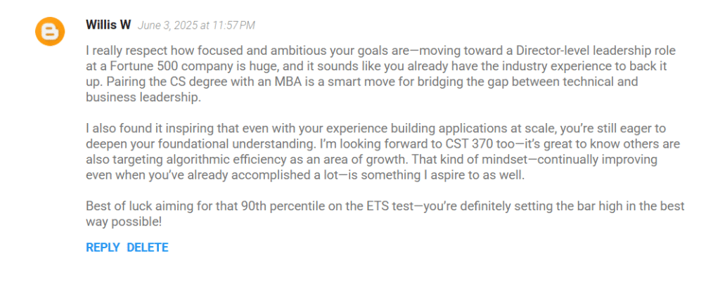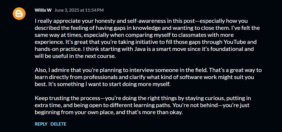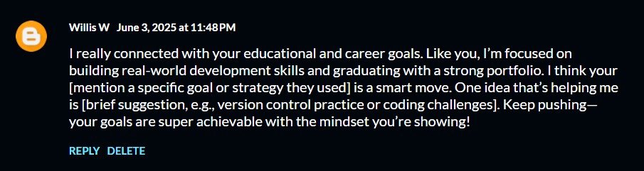 This week gave me a chance to reflect more deeply on both my long-term goals and the practical steps I need to take to get there. Reviewing my teammates’ educational and career goals helped me realize that everyone is at different stages—some have years of experience and are aiming for leadership roles, while others (like me) are focused on building a strong foundation and gaining confidence in programming and system design. Commenting on their posts was encouraging—it made me feel like I’m not alone in facing challenges or doubts.